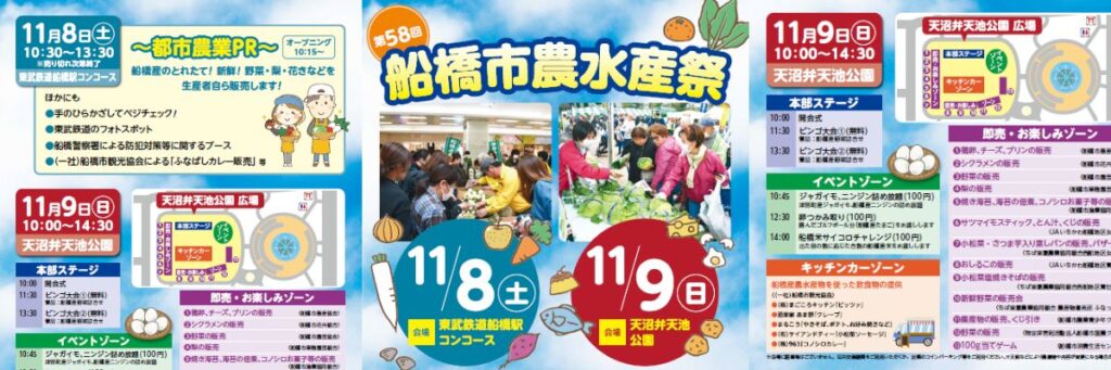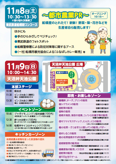 9日(日)は天沼弁天池公園で「農水産祭」として、農水産物の即売はもちろん、船橋産の農水産物を調理した模擬店やキッチンカーも出店。ビンゴ大会などのイベントも実施。